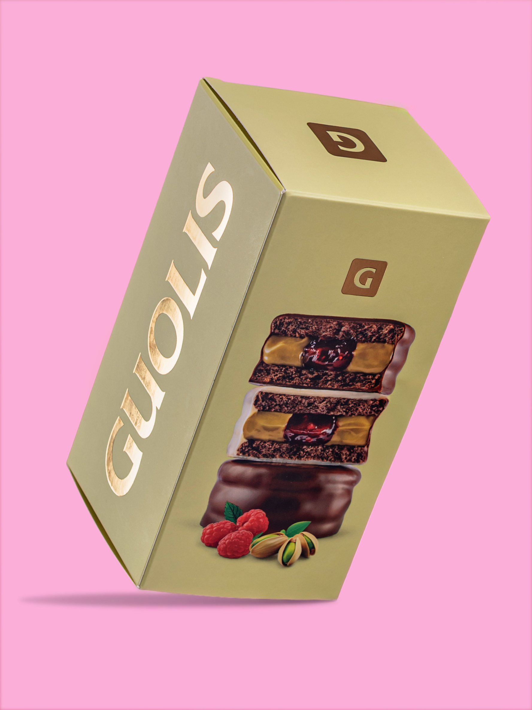 Fotografía de packaging para los alfajores de Pistacho y frambuesa de Guolis