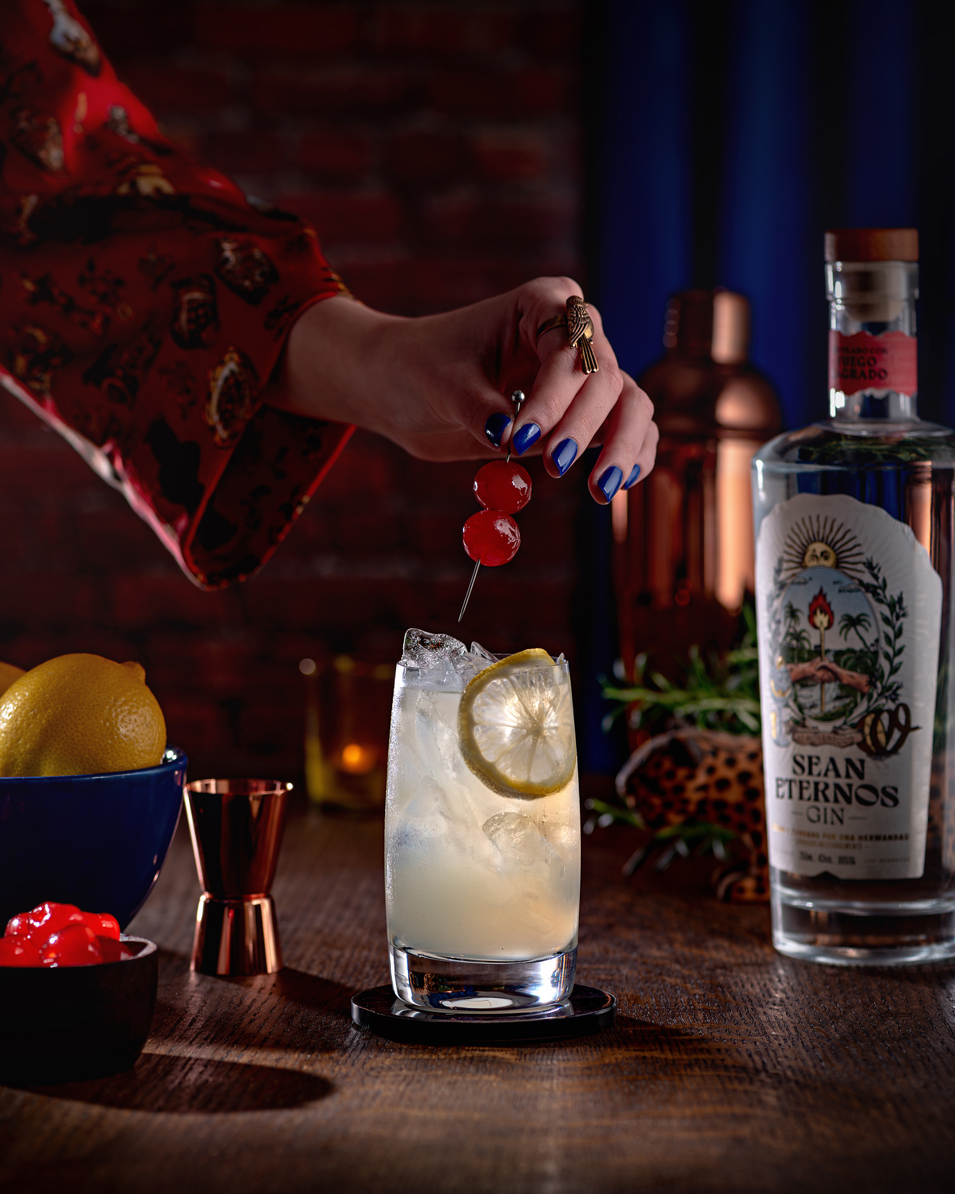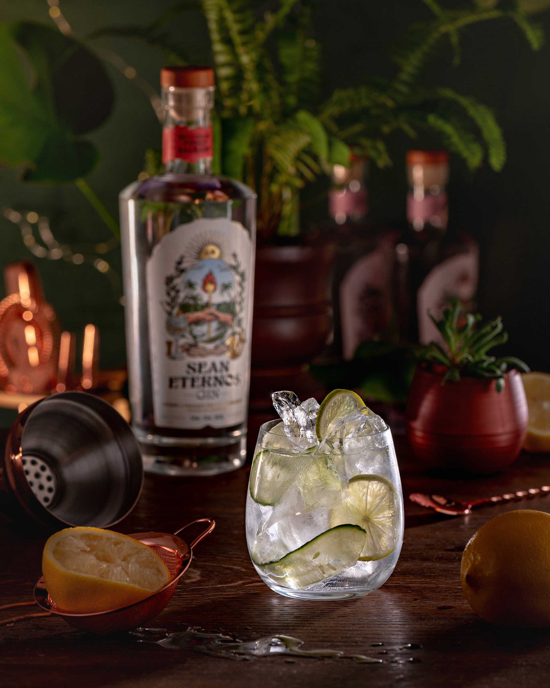 Fotografía de producto y food styling para Sean Eternos, gin artesanal. Capturamos la esencia del gin con escenarios cuidadosamente estilizados y detalles que resaltan su calidad artesanal y autenticidad.
